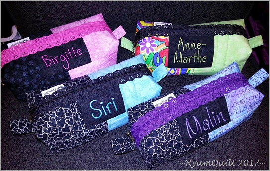 Idag har jeg fortsatt med bestillinger, og sydd disse tre toalettmappene. Som dere ser, så har jeg dekket over navnene på disse, da det er en viss fare for at de kan bli gjenkjent :-)